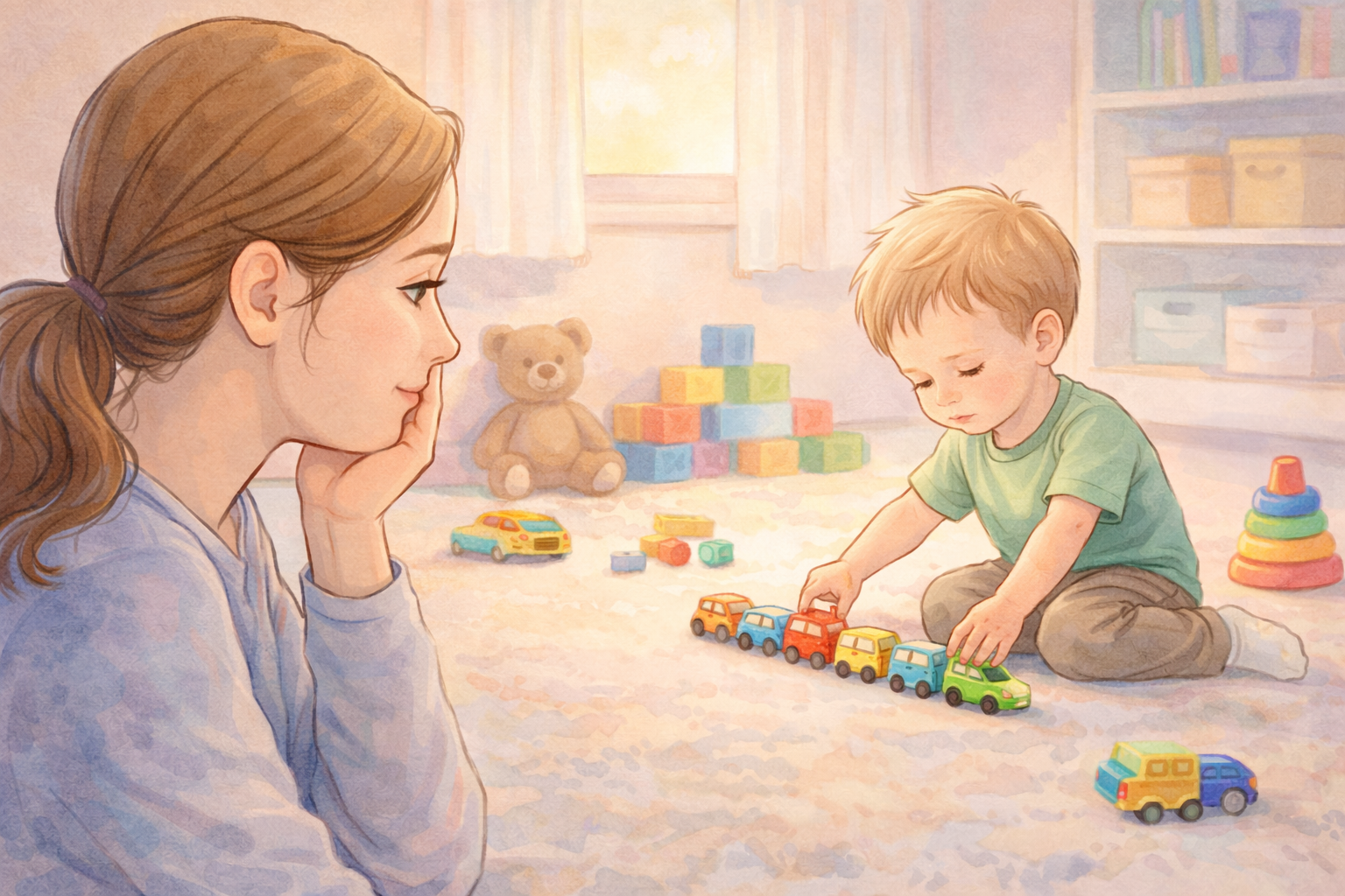 Entre los 2 y 3 años comienza el juego de simulación (dar de comer a un muñeco, hablar por teléfono de juguete, etc.). Si notas que no juega a imitar acciones de la vida cotidiana o no muestra nada de juego simbólico hacia los 2 años, puede ser una señal. En lugar de eso, algunos niños con autismo se enfocan en ordenar objetos o en detalles inusuales (por ejemplo, girar las ruedas de un carrito insistentemente en lugar de jugar “normalmente” con el carrito).